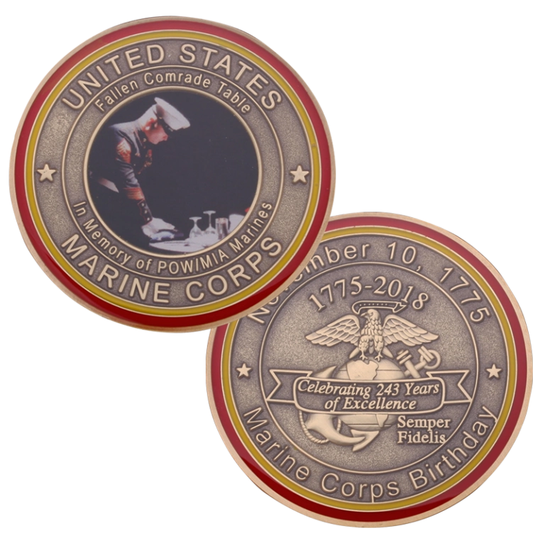 Honoring 243 years of rich Marine Corps history, the annual Birthday Ball is a time for all Marines to reflect and to celebrate. This event is enveloped with many traditions such as the Fallen Comrade table. It is often seen at not only the Birthday Ball, but also other formal military events such as Mess nights. The table has the same setting as the guests and serves as a reminder of those who have made the ultimate sacrifice for our freedom. This year’s coin honors the Marines that have gone before us and can only attend the Birthday Ball in spirit.