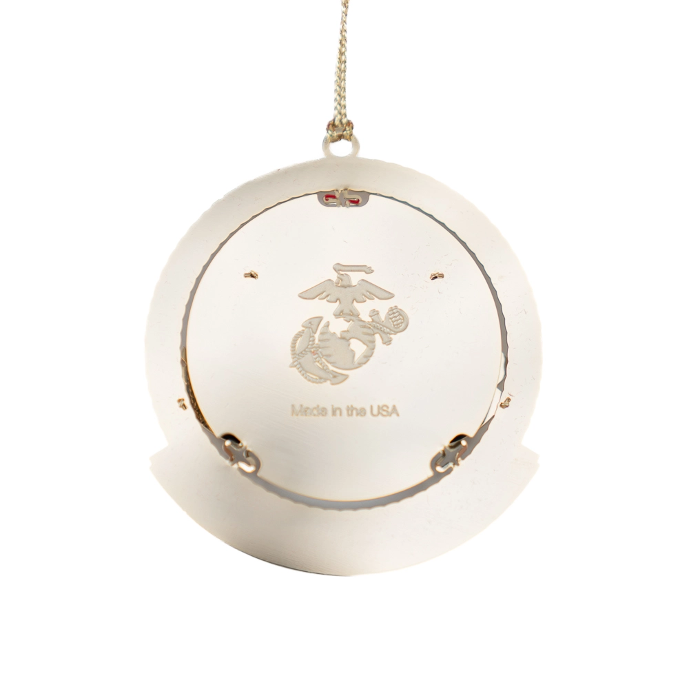 To celebrate the Marine Corps’ 250th birthday, The Marine Shop has introduced a special ornament for this momentous occasion! This beautiful ornament is proudly made in the USA and features our exclusive 250th Birthday Ball logo. This piece is finished with frosted gold plate with a classic rope border with the text of the logo raised above the backing of the ornament and a gold cord to hang the ornament. It shows an etched EGA on the back of the ornament. The ornament comes packaged in a lovely gold box with the 250th logo hot-stamped onto the lid of the box and a red velvet interior holding the ornament.