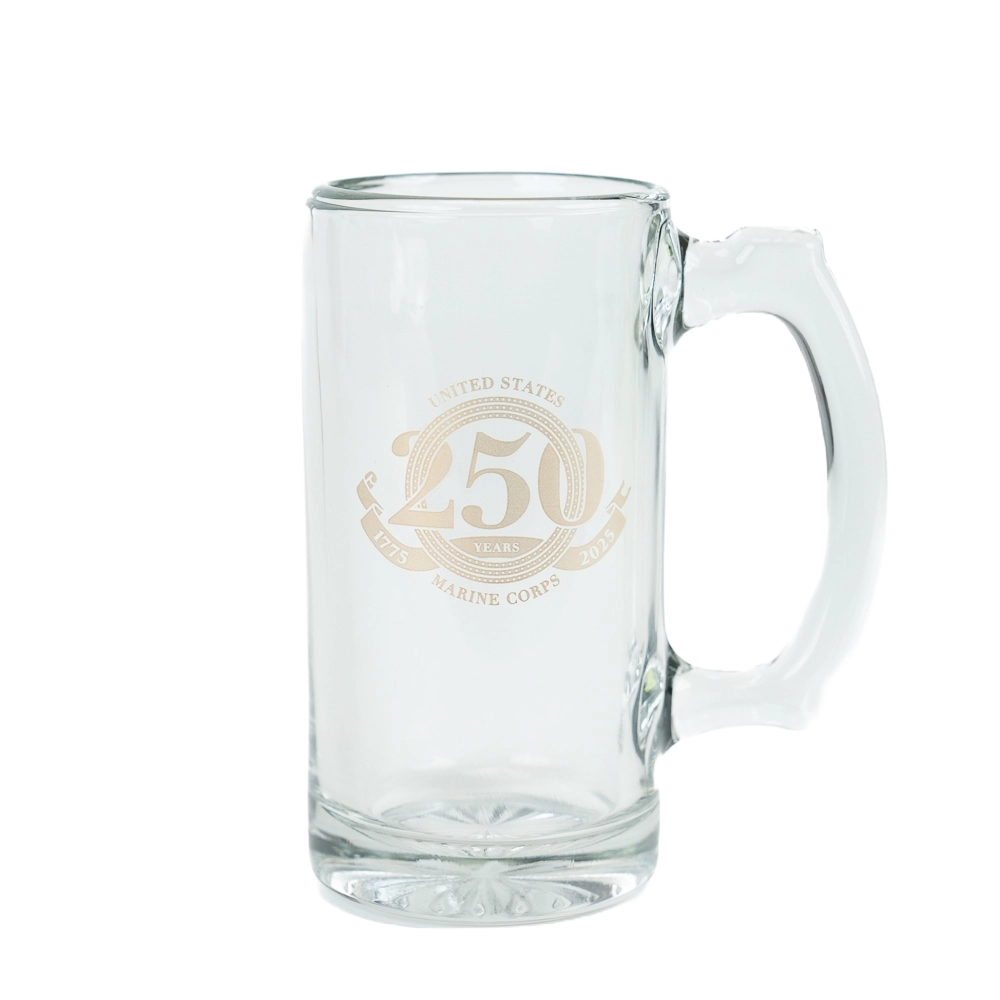 Drink a toast to 250 years of the United States Marine Corps! This glass stein is printed with our exclusive 250th Birthday Ball design, featuring 250 stars encircled within the larger “250” to commemorate all the years of honor and service to the Corps. A great gift to celebrate this momentous occasion!