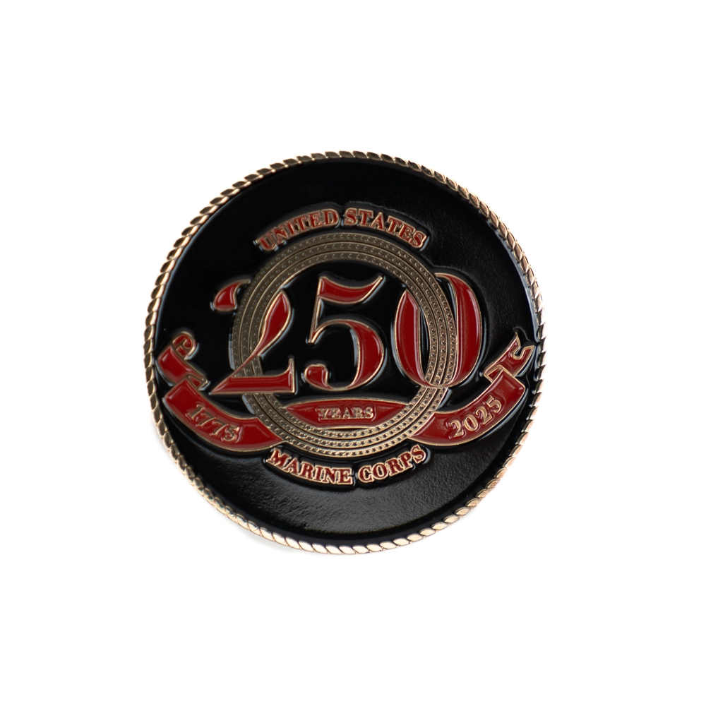 Presenting challenge coins, some say, has been a tradition dating back to the Roman Empire. Others say it began much later during WWI with a captured lieutenant who used his medallion to prove his unit identity. More modern stories tell of always being ready for a “coin check” to prevent from having to buy drinks for the entire bar by showing your coin when asked. Whatever stories you choose to believe, commemorate the 250th Marine Corps anniversary with our 250th Birthday Ball Coin! Present the coin as a gift for this significant occasion, or keep it as a memento! The coin design features our exclusive 250th logo set in black enamel on the front, and the iconic Eagle, Globe, and Anchor encircled by stars and set in red enamel on the back. Both sides are decorated with a classic rope border.