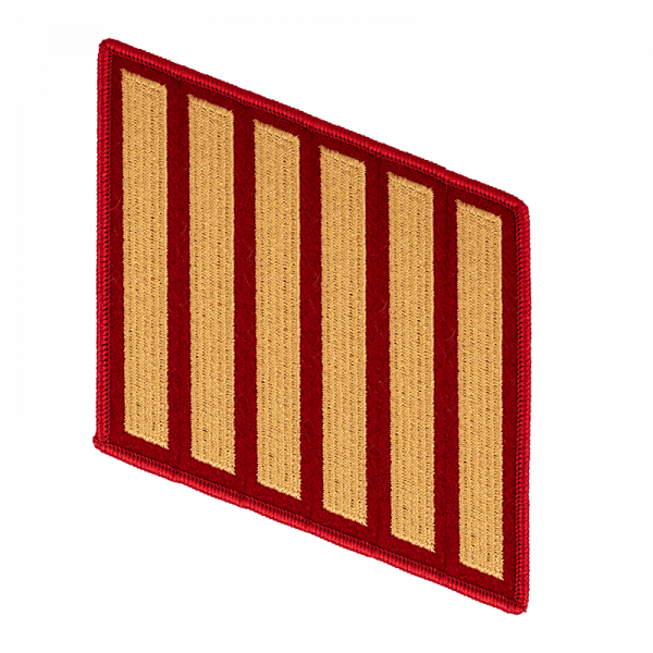 Six bars, gold on red embroidered service stripe for women’s Blue Dress uniform.