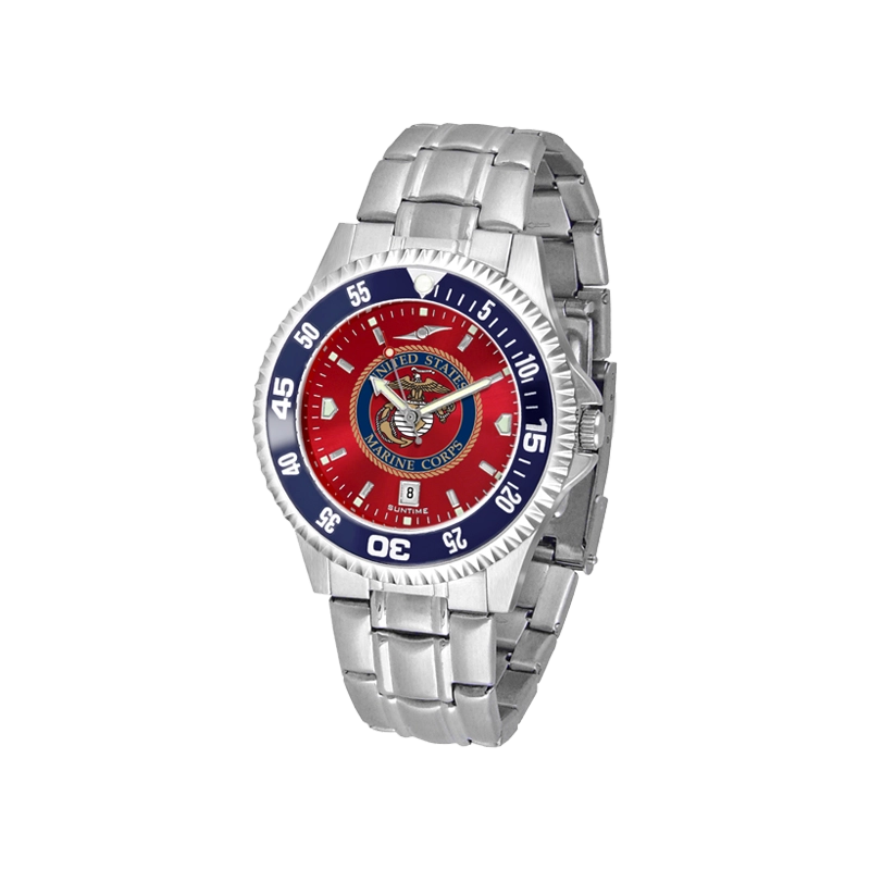 Competitor Stainless Steel AnoChrome Watch with Color Bezel by Suntime® features a functional rotating bezel with AnoChrome dial option. Red watch face has a stunning radial reflection similar to that of the underside of a CD. At the center is a full color USMC emblem. A durable, long-lasting stainless steel strap together with a date calendar rounds out this classic timepiece.