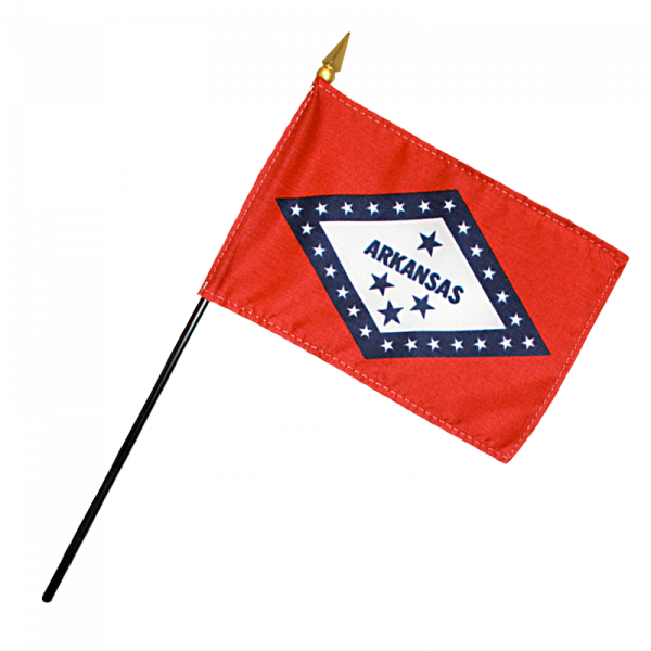 The flag of Arkansas consists of a diamond surrounded by white stars on a red field. Within the diamond thre is one star above and three stars below the word Arkansas.