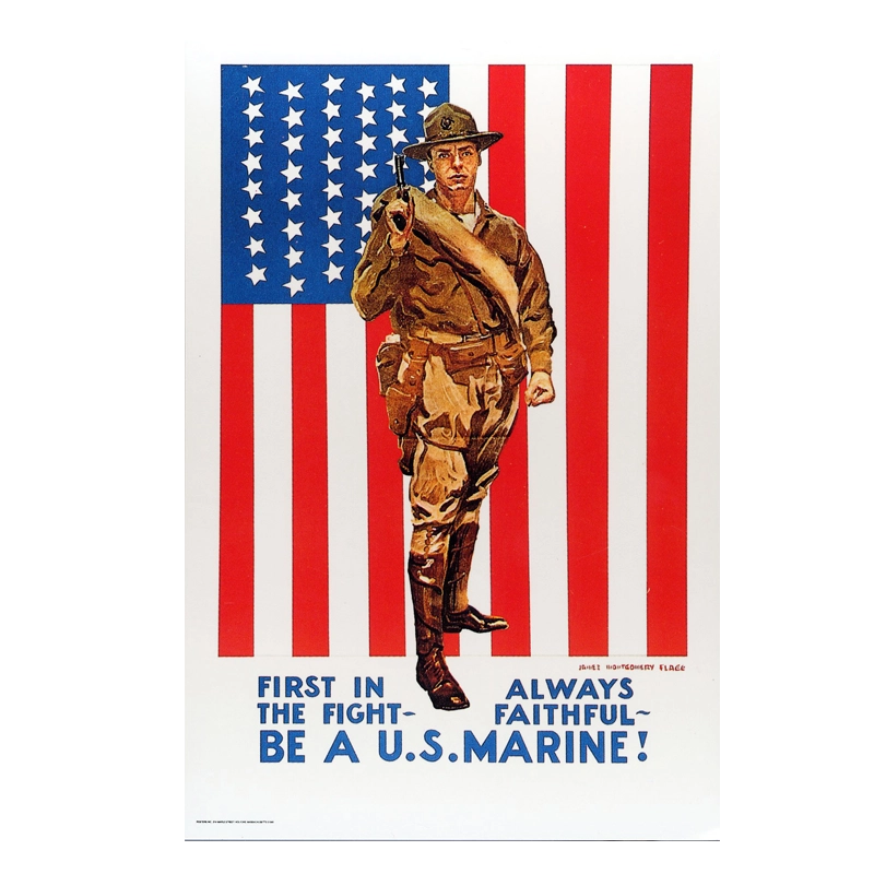 Postcard uses historical USMC “Be A U.S. Marine” recruiting poster on front. Approximately 4″ x 6″.