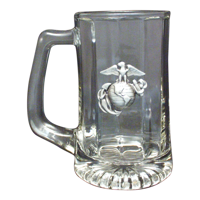 A handsome glass stein with starburst light reflecting pattern bottom and three-dimensional pewter Eagle, Globe & Anchor on the front. This USMC glass beer mug is extremely heavy and durable.