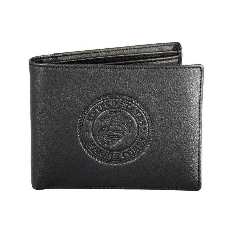 Black leather bifold wallet has USMC emblem debossed on the front. Interior has 3 card slots and bill compartment. Built in RFID chip protection. Removable ID card holder within the wallet holds up to 2 identification cards.