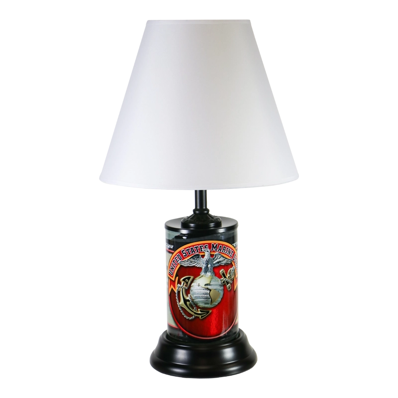 Looking for a new addition to your office or man cave? Try this all-metal lamp with black finish. Lamp base has Eagle, Globe & Anchor against red background with “United States Marine Corps” banner at the top. Wrap around design depicts Marines in action. White fabric shade diffuses light making this lamp a great accent piece for your office, man cave, or living room.