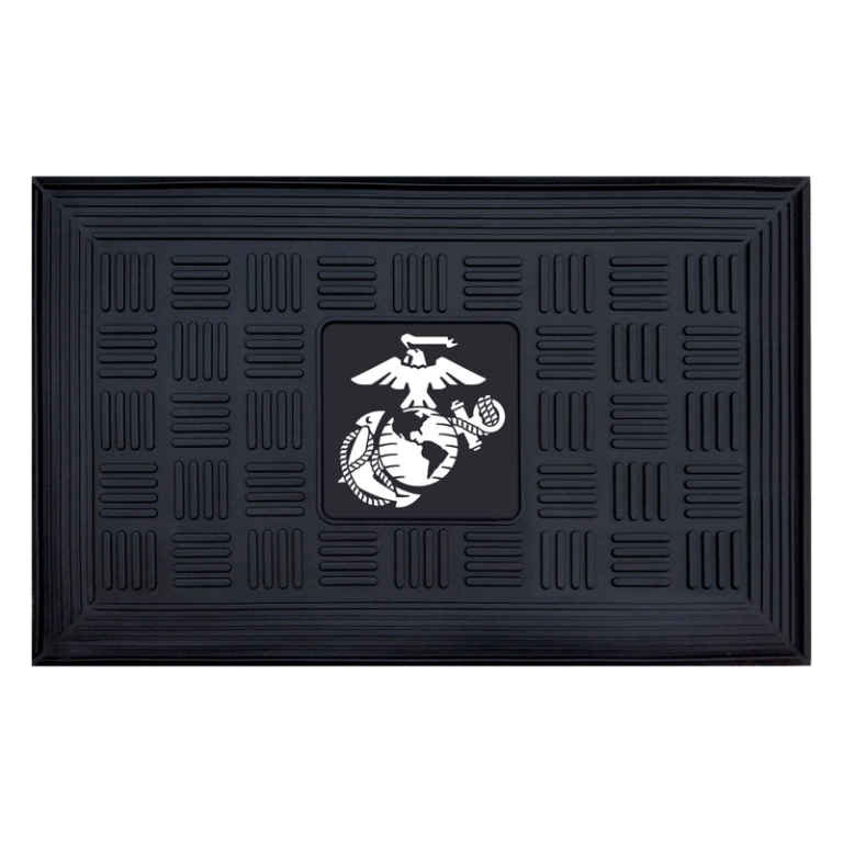 Make a great first impression when guests come over with this officially licensed USMC Marines Door Mat by Sports Licensing Solutions. Adorned with a white Eagle, Globe & Anchor silhouette at the center, this door mat make a statement while keeping dirt and mud from entering your home. Heavy duty vinyl construction ensures a durable mat. Deep reservoirs capture and contain water and debris. Rugged ribs scrape shoes clean so dirt and debris isn’t tracked into your home.