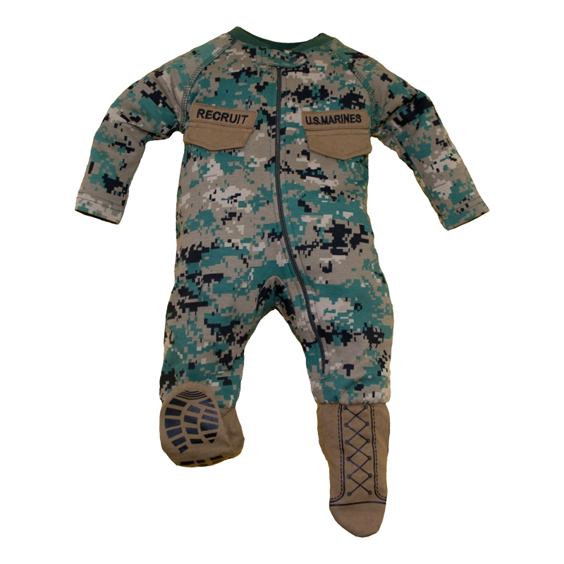 This adorable woodland camo print crawler is embroidered with name tapes that say “U.S. Marines” and “Recruit” on them. It also features flap pockets on the chest, easy zipper for quick diaper changes, and screen printed “combat boots” on the feet! Available in 0-3 months to 9-12 months.