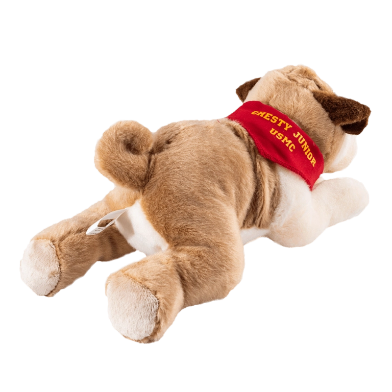 Chesty Junior the bulldog is wearing a red bandana with his name “Chesty Junior -USMC” in yellow. Stuffed Bulldog Flopsie Plush Dog by Aurora is ready to play all day and cuddle all night. He’s ready to be your little Marine’s best friend!