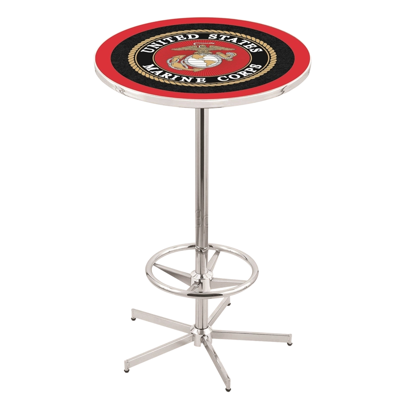 Pub table top utilizes a scratch resistant and UV protected acrylic top which boasts a full color USMC emblem. Plating grade steel used to build the frame ensures it will withstand the abuse of the rowdiest of friends for years to come. Chrome table base and foot ring with your choice of black extruded or chrome finish edging on table top.
