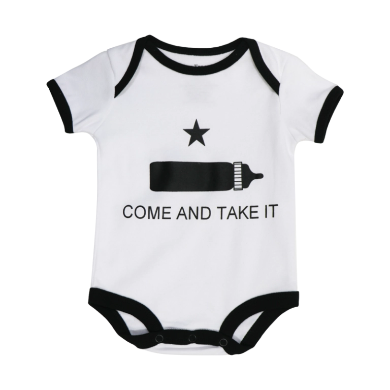 “Come And Take It” onesie is modeled after the phrase used at the Battle of Gonzales during the Texas Revolution. Tiny Trooper® made some minor changes to the original Gonzales flag and came up with its own unique design. They didn’t want to give up the cannon, and babies don’t want to give up the bottle. It is a hit with parents! White onesie with black neck, sleeve, and leg opening trim. Three snap opening allows for easy diaper changes. Available in 3 months to 12 months.