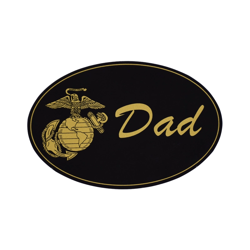 Black oval magnet features the Eagle, Globe & Anchor and “Dad” in gold.