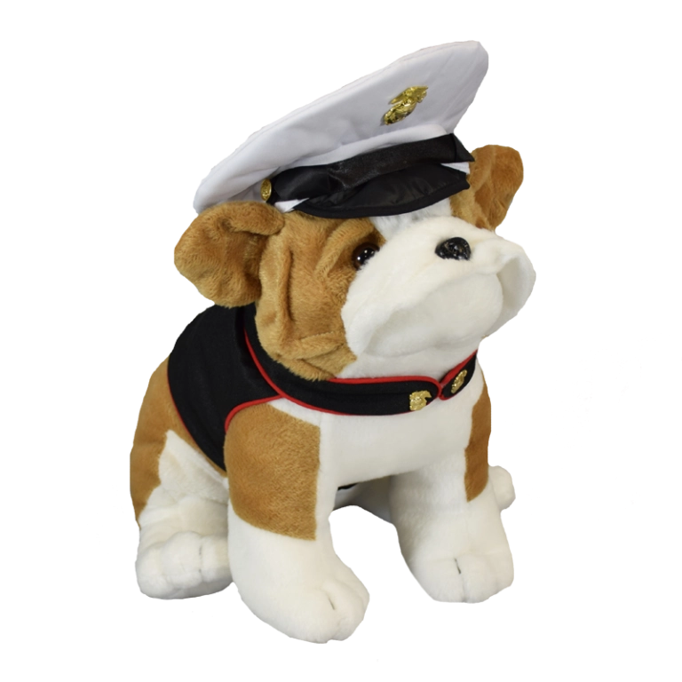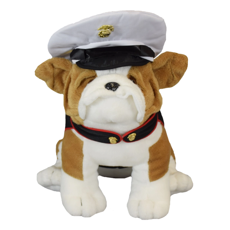 Who can resist a bulldog in uniform? Our “Chesty” stuffed animal is wearing his USMC blues to impress the ladies and kids. From his cover to collar ornaments, he’s all Marine.