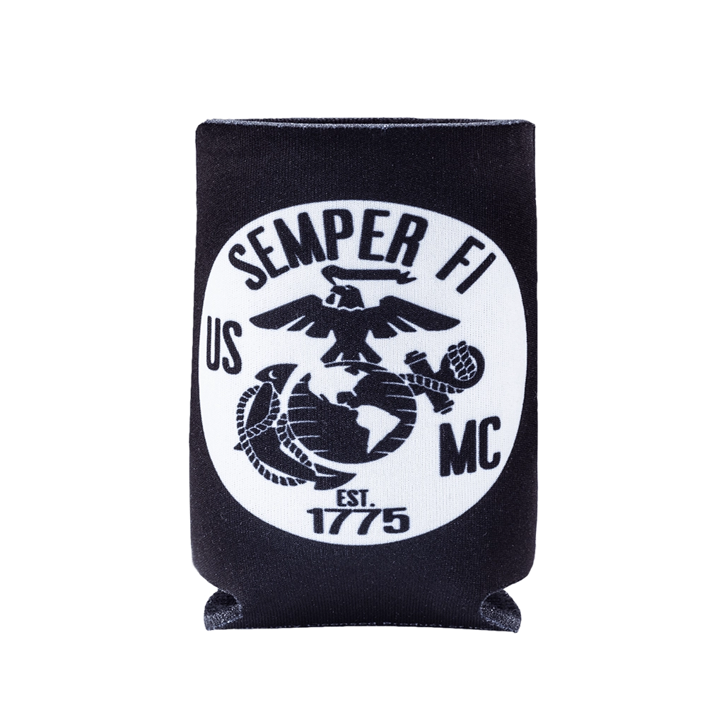 Black can koozie has white circular design with USMC elements in the negative space. Top of design is “Semper Fi” with “Est. 1775” near the bottom. At the center is an Eagle, Globe & Anchor. Collapsible neoprene drink sleeve is great solution for keeping your favorite drink cool at outdoor events.