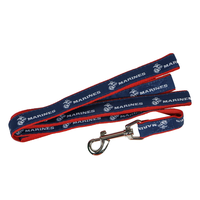 Make daily walks fun by showing off this USMC pride leash! Pet leash features a blue woven polyester ribbon with Eagle, Globe & Anchor and “Marines” in white, set on top of red webbing. Hardware includes a metal lobster clasp that easily secures to your pet’s collar.
