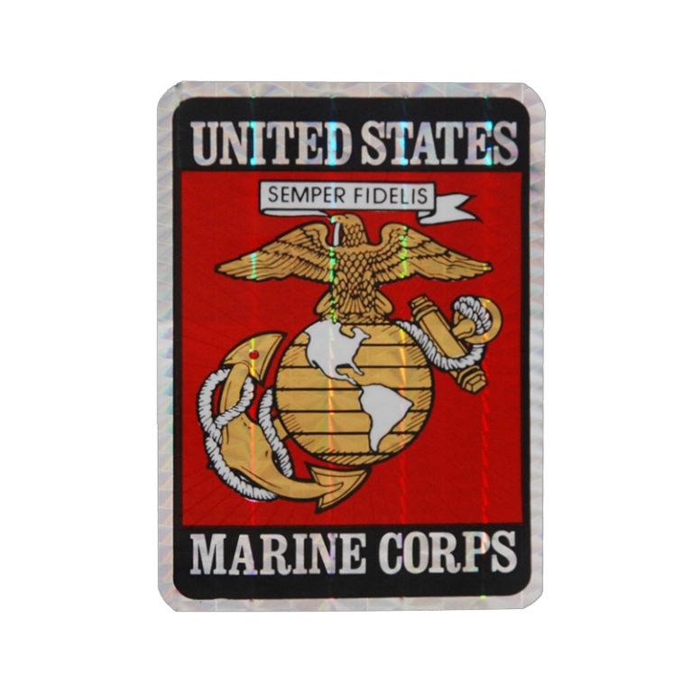 Gold Eagle, Globe & Anchor against a red background with prismatic border.