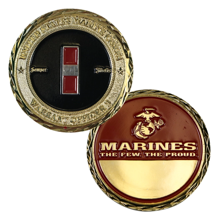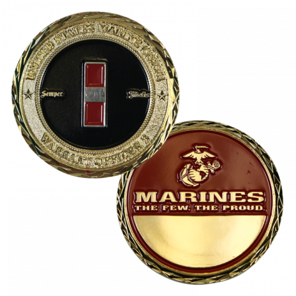 Engravable challenge coin has full color Chief Warrant Officer 3 rank insignia with “Semper Fidelis” against black enamel background and diamond edge pattern. Reverse has Eagle, Globe & Anchor and “Marines – The Few. The Proud.” against red enamel background with engravable area below.