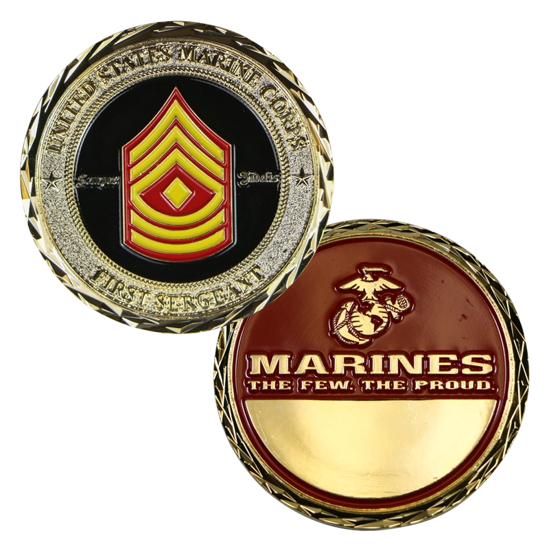 Engravable challenge coin has full color First Sergeant chevron with “Semper Fidelis” against black enamel background and diamond edge pattern. Reverse has Eagle, Globe & Anchor and “Marines – The Few. The Proud.” against red enamel background with engravable area below.