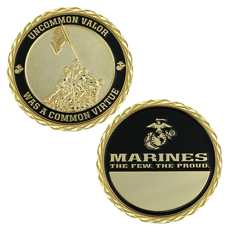 Engravable challenge coin has diamond edge pattern with black enamel ring around Iwo Jima flag raising in bas relief. Reverse has Eagle, Globe & Anchor against black enamel background with engravable area below.