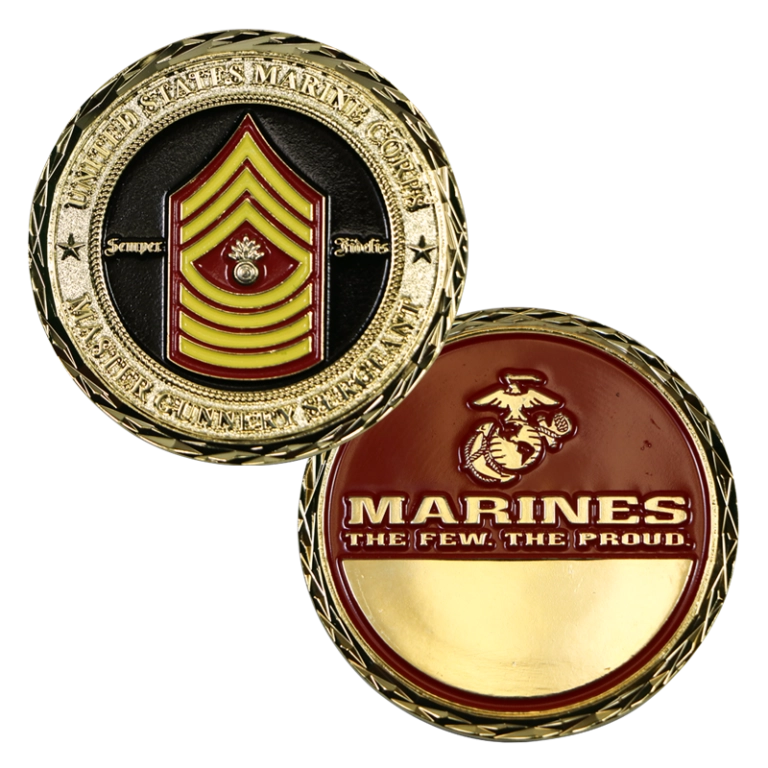 Engravable challenge coin has full color Master Gunnery Sergeant chevron with “Semper Fidelis” against black enamel background and diamond edge pattern. Reverse has Eagle, Globe & Anchor and “Marines – The Few. The Proud.” against red enamel background with engravable area below.
