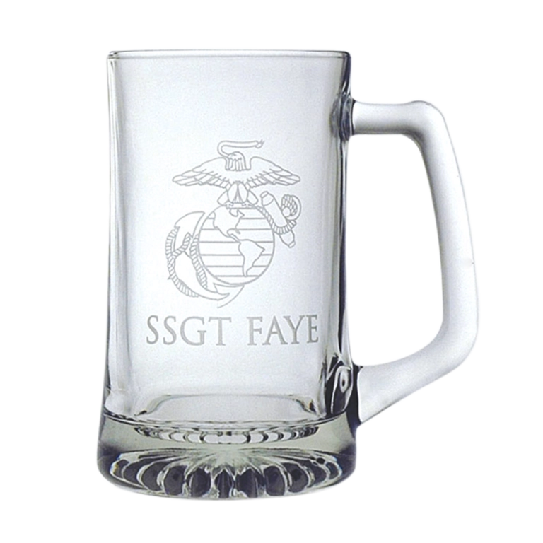 Large beer stein etched with an Eagle, Globe & Anchor. Purchase this beer stein with only the design, or add your name, name and rank, or message for no additional fees.