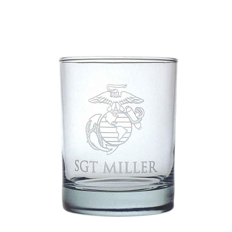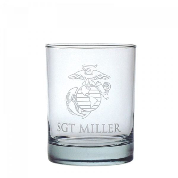 Double old-fashioned rock glass etched with an Eagle, Globe & Anchor. Purchase this item with only the design, or add your name, name and rank, or message for no additional fees.