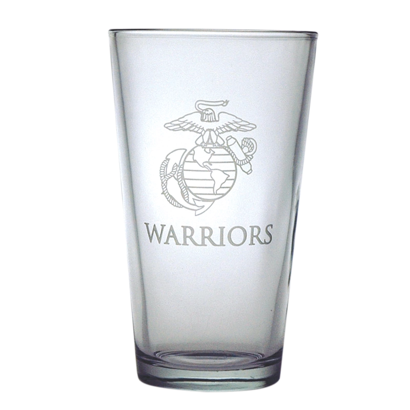 Mixer glass etched with an Eagle, Globe & Anchor. Purchase this glass with only the design, or add your name, name and rank, or message with no additional fees.