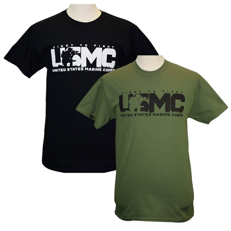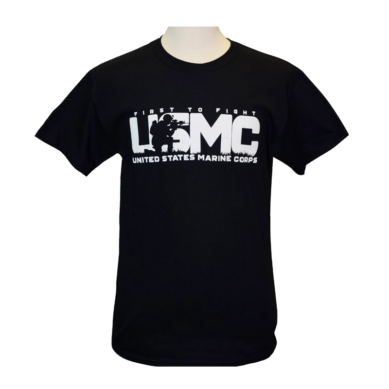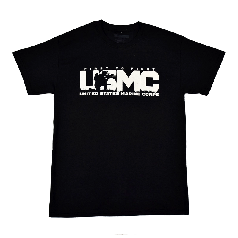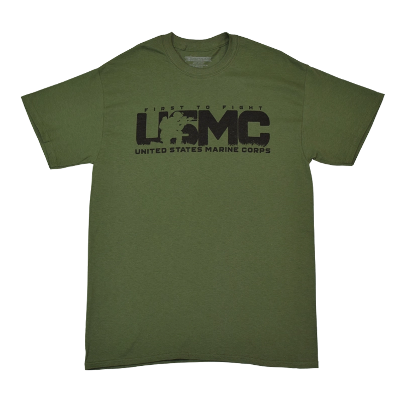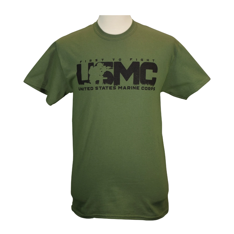 USMC “First to Fight” crewneck t-shirt is guaranteed to stand out. Large chest design has “First to Fight” above extra large “USMC” with a silhouette of a combat Marine kneeling and holding his rifle at the ready. Underneath is “United States Marine Corps.” Available in Black or Green, sizes M – 2XL.