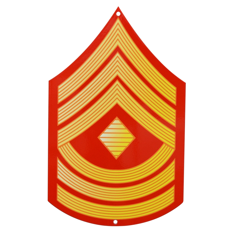 Full color First Sergeant rank chevron plaque is made from heavy 14 Gauge Steel, which gives it a substantial and rich feel. Created using Photosteel™ – a processing technology where an image is indelibly memorialized on a virtually indestructible metal substrate. To add depth to this Blue Dress chevron plaque, the shading for gold fades to an orange gold tint from left to right.