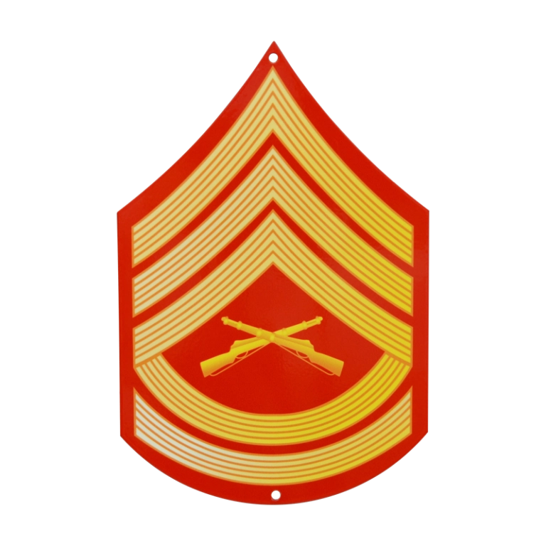 Full color Gunnery Sergeant rank chevron plaque is made from heavy 14 Gauge Steel, which gives it a substantial and rich feel. Created using Photosteel™ – a processing technology where an image is indelibly memorialized on a virtually indestructible metal substrate. To add depth to this Blue Dress chevron plaque, the shading for gold fades to an orange gold tint from left to right.