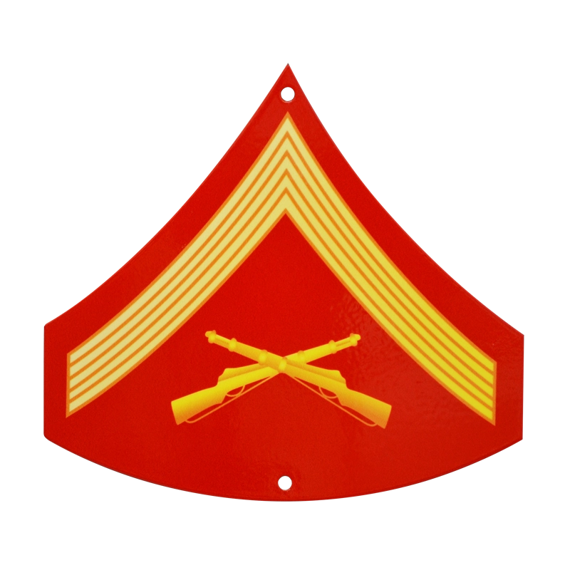 Full color Lance Corporal rank chevron plaque is made from heavy 14 Gauge Steel, which gives it a substantial and rich feel. Created using Photosteel™ – a processing technology where an image is indelibly memorialized on a virtually indestructible metal substrate. To add depth to this Blue Dress chevron plaque, the shading for gold fades to an orange gold tint from left to right..