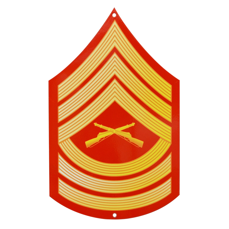 Full color Master Sergeant rank chevron plaque is made from heavy 14 Gauge Steel, which gives it a substantial and rich feel. Created using Photosteel™ – a processing technology where an image is indelibly memorialized on a virtually indestructible metal substrate. To add depth to this Blue Dress chevron plaque, the shading for gold fades to an orange gold tint from left to right.