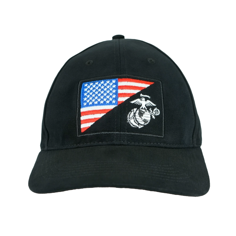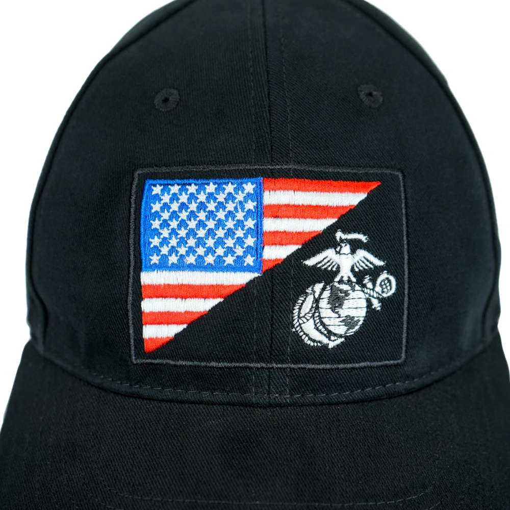 Show your pride with the Full Color US Flag/EGA Hat in Black. Featuring a bold US flag and Eagle, Globe, and Anchor split design, this adjustable cap combines patriotic style with everyday functionality.