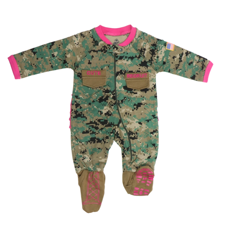 This adorable girl’s crawler in woodland camo has hot pink trim at the neck and cuffs, as well as a hot pink ruffled bottom. Faux chest pocket flaps in brown have “Cute” and “Recruit” name tapes in hot pink. US flag patch on left arm and “boots” with pink laces complete this outfit, as well as a full front zipper for easy diaper changes. Fun gift for your little Marine Recruit princess. Available in 0-3 months to 9-12 months.