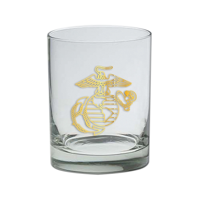 Double old-fashioned rock glass with gold Eagle, Globe & Anchor screened on front.