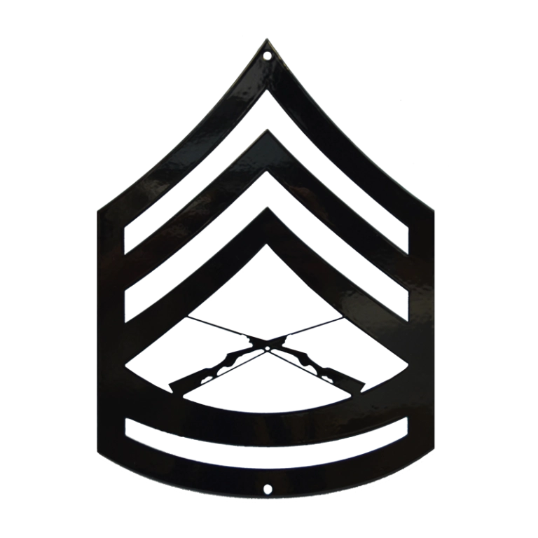 Gunnery Sergeant rank insignia chevron is made from heavy 14 Gauge Steel in Black. Created using PhotoSTEEL™ – an environmentally-friendly, U.S. patented process that permanently bonds high resolution color graphics to a custom shaped metal sign.