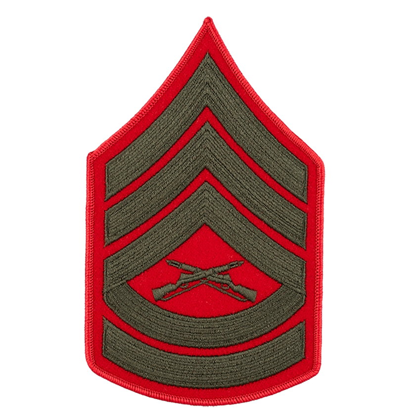 Green on red embroidered chevrons for female Gunnery Sergeant Service Alpha uniform.