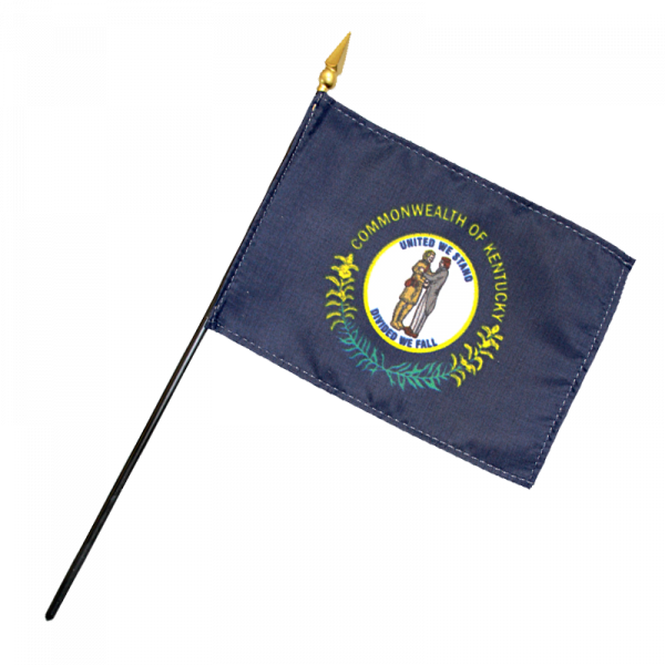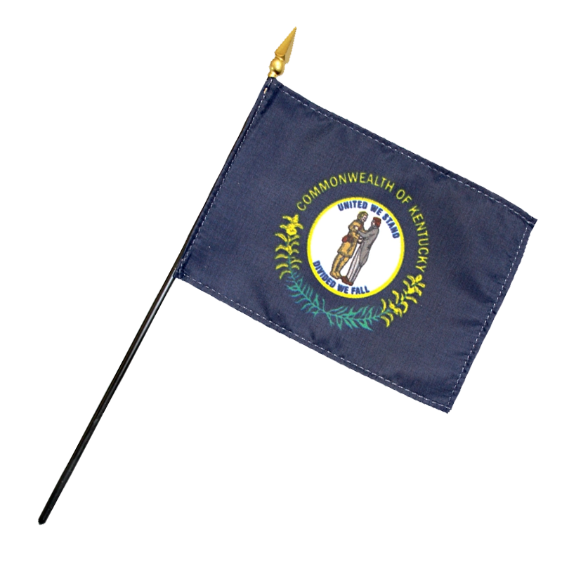 The flag of Kentucky consists of the Commonwealth’s seal on a navy blue background, surrounded by the words “Commonwealth of Kentucky” above and the state flower below. The state motto: “United We Stand, Divided We Fall” circles them.