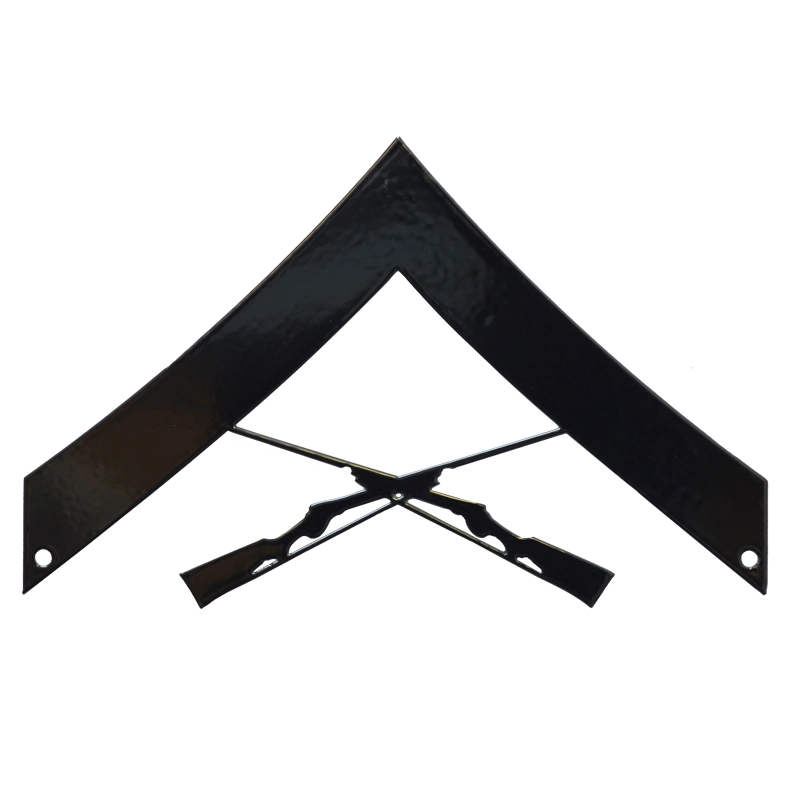 Lance Corporal rank insignia chevron is made from heavy 14 Gauge Steel in Black. Created using PhotoSTEEL™ – an environmentally-friendly, U.S. patented process that permanently bonds high resolution color graphics to a custom shaped metal sign.