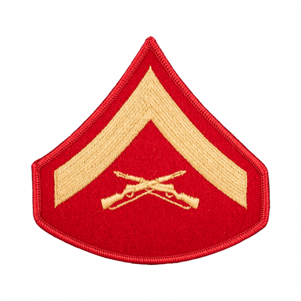 Gold on red embroidered chevrons for Lance Corporal Blue Dress uniform.