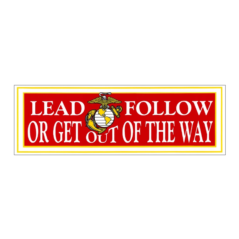 White bumper sticker with red background has “Lead Follow or Get Out of The Way” with the Eagle, Globe & Anchor.