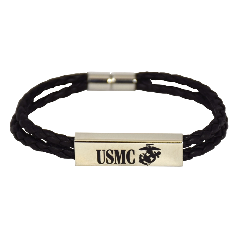 Double leather band bracelet will appeal to both men and women with its unisex style. Black braided leather band has silver plate engraved with “USMC” and Eagle, Globe & Anchor.