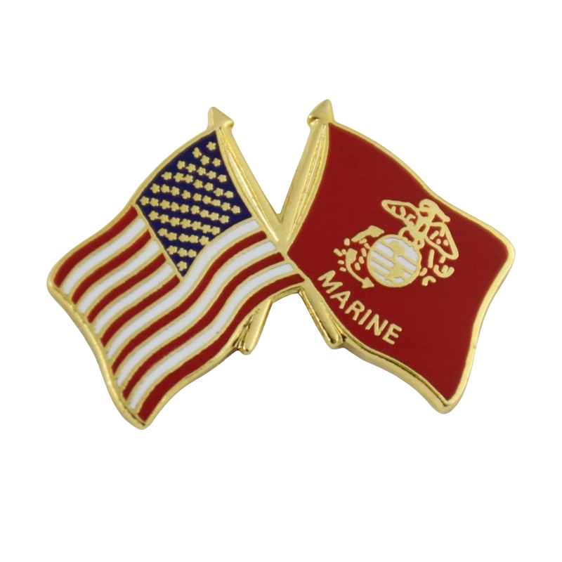 Crossed Marine Corps and US Flags lapel pin. Measures approximately 1 1/8″ x 3/4″.