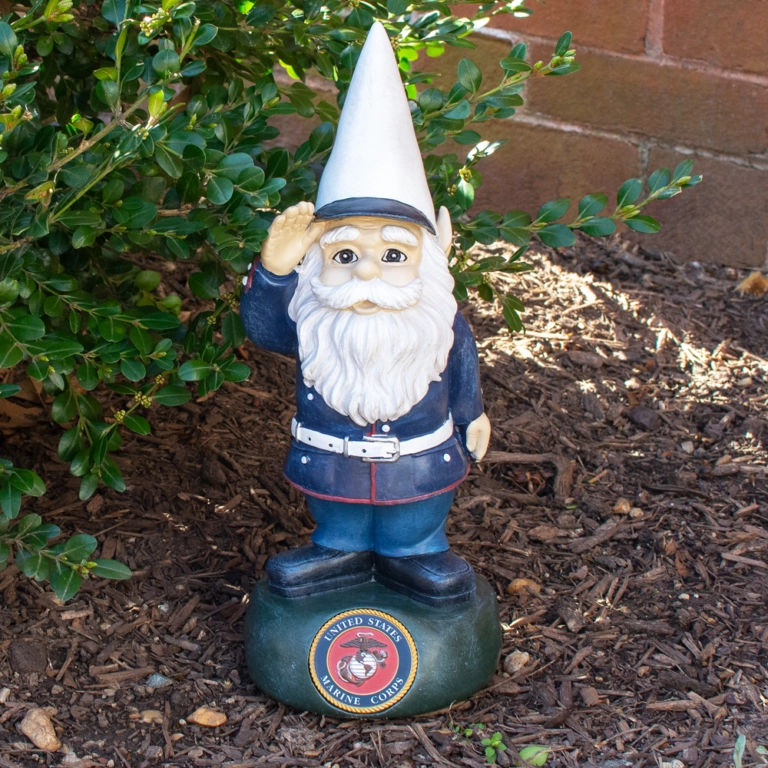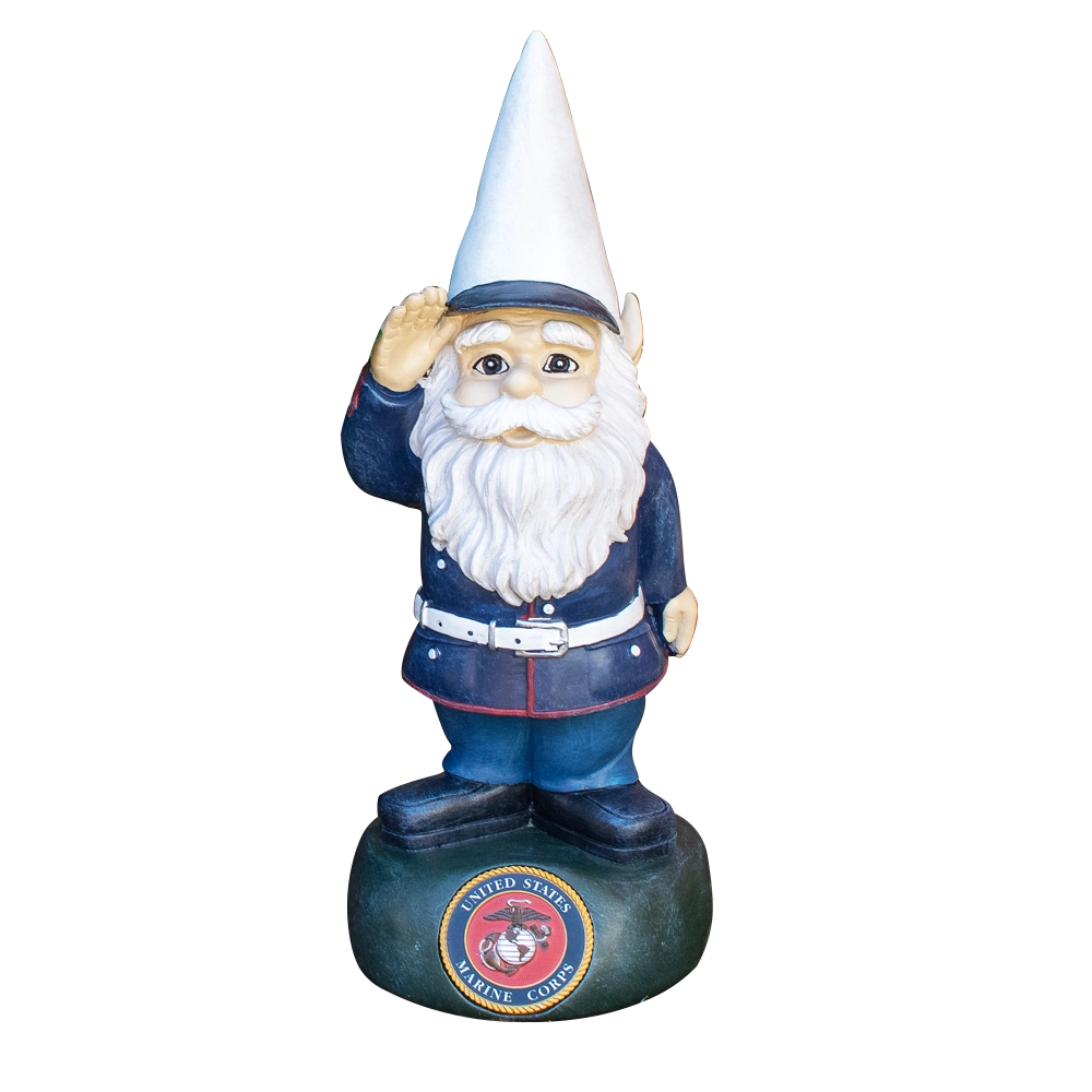 Marine Corps military garden gnome is dressed up in his Blue Dress uniform and stands on a green base with the USMC emblem front and center.