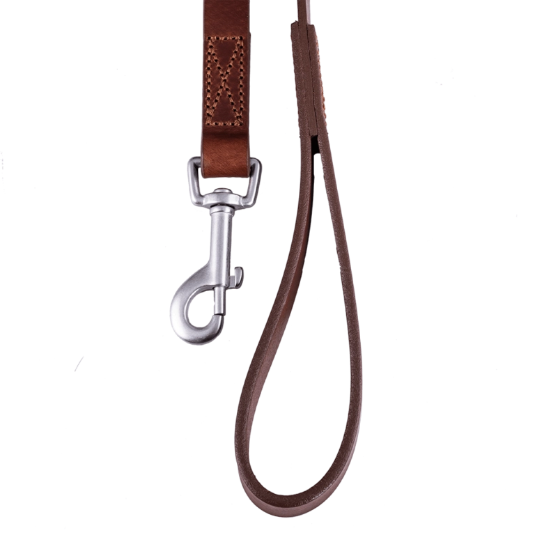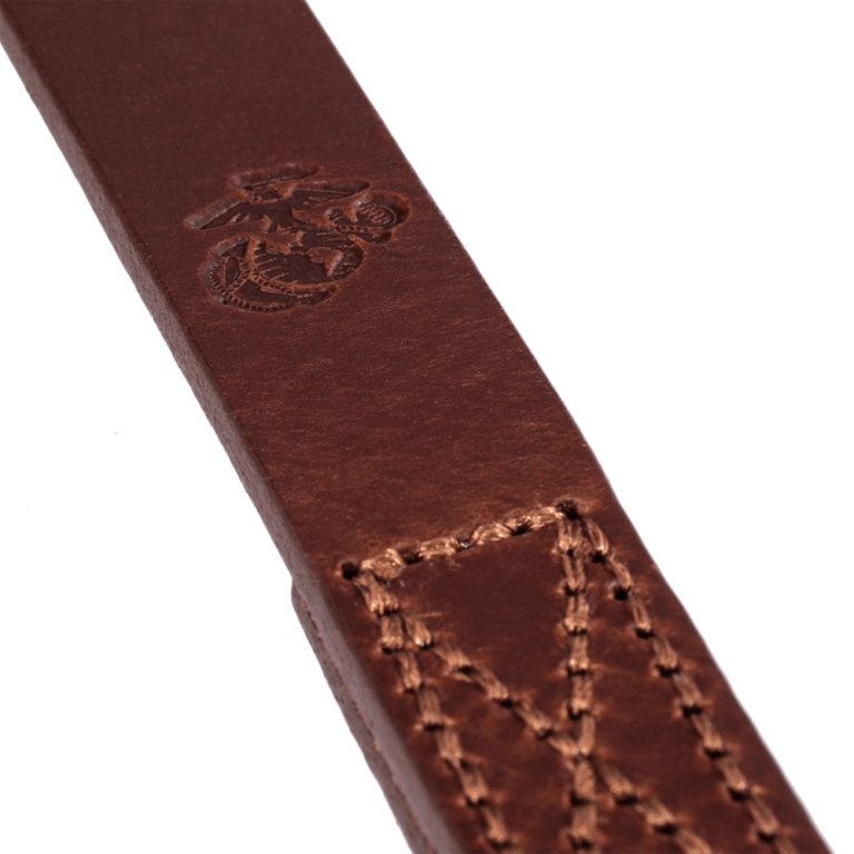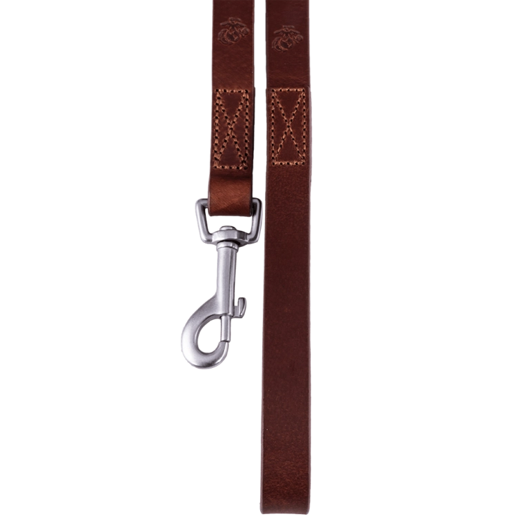 This high quality leather pet leash has the Eagle, Globe, and Anchor cutout above the handle. At 57 inches long and 3/4 of an inch wide, this leash is strong and works for nearly any size of dog.