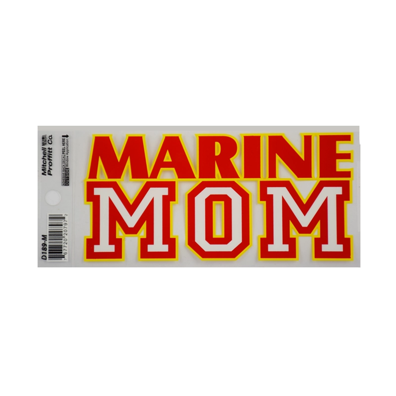 Window decal has “Marine” in red block print with yellow outline. “Mom” is in white letters with red outline.