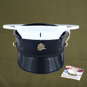 Officer’s Service cover set includes: company grade Officer frame from Bernard Cap, green cover with quatrefoil, black screwposts, and chin strap.