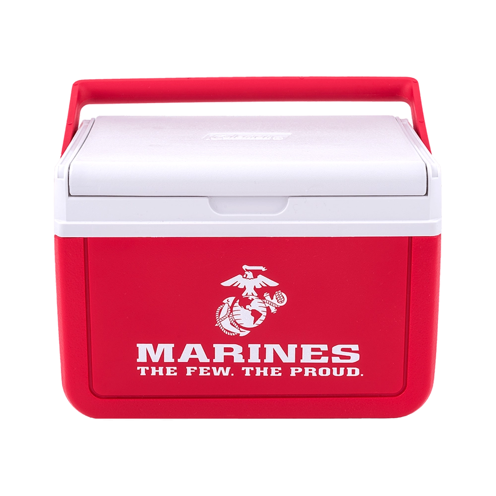 5 Quart FlipLid™ Cooler in red with white top and white Marine Corps design screened on the front is your summer must-have. Show USMC pride at your next picnic, tailgate party, or even lunch! Front of cooler has white Eagle, Globe & Anchor with the motto “Marines – The Few. The Proud.” Drink cooler converts to a mini table and has plenty of space to pack a full meal. Bail handle makes carrying up to 6 cans easy with just one hand. Coleman’s trademarked hinged flip lid doubles as a drink tray with molded beverage holders. When the fun is done, the EZ-Clean top wipes clean, so you’re ready for your next adventure.