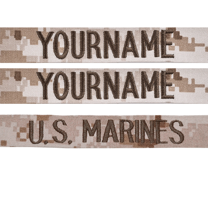 Embroidered name and service tapes for wear on the Marine Corps Combat Utility Uniform (MCCUU). Each set includes 2 name and one USMC tape.
